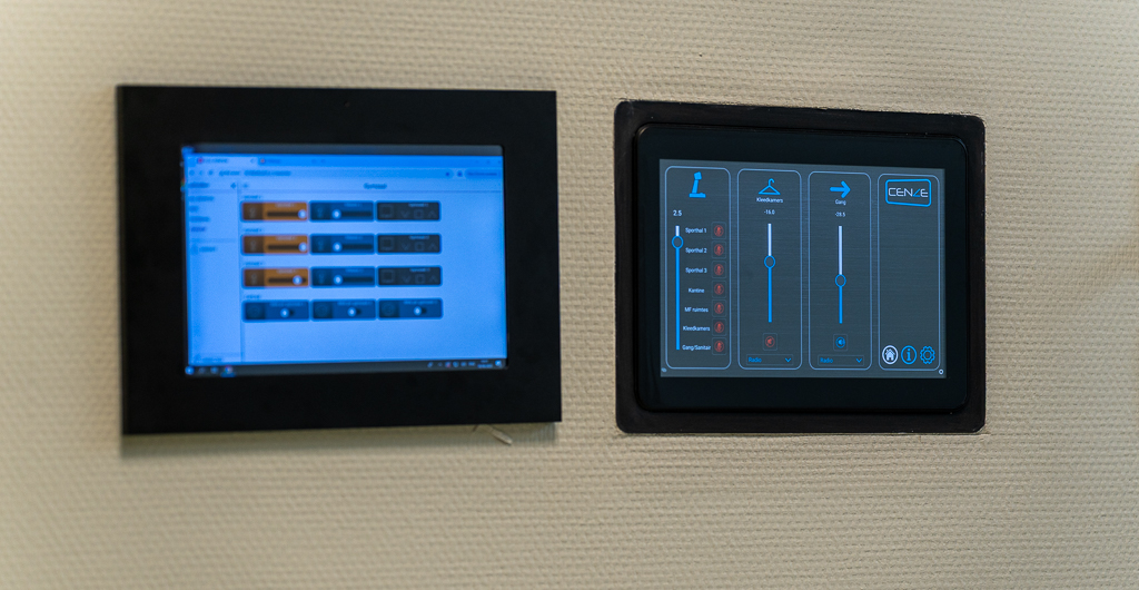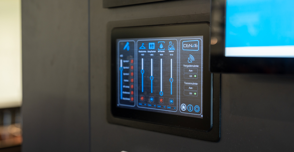 Het hart van het systeem wordt gevormd door Cenze, onze slimme en overzichtelijke bedieningsoplossing. De bediening is zó gebruiksvriendelijk dat werkelijk iedereen ermee overweg kan. Binnen slechts enkele aanrakingen op het touchscreen kan het volledige pand — van sportzalen tot kantine en multifunctionele ruimtes — worden gekoppeld of juist losgeschakeld.